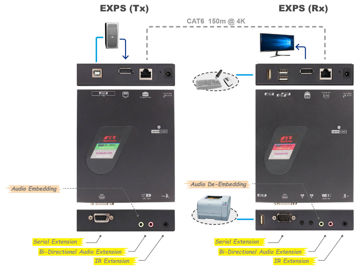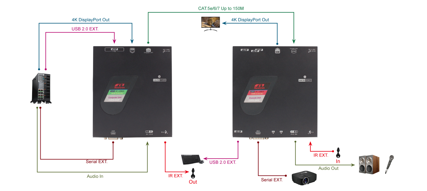 DP USB延长器,EXPS-M043,由一个电脑单元(EXPS-043P)及一个控制端单元(EXPS-043S)组合而成.经由Catx网路线延长DisplayPort/ Audio/ USB 2.0/ IR/ RS-232等信号最远可达150M,DP分辨率最高可达3840x2160@30Hz(4:4:4)。